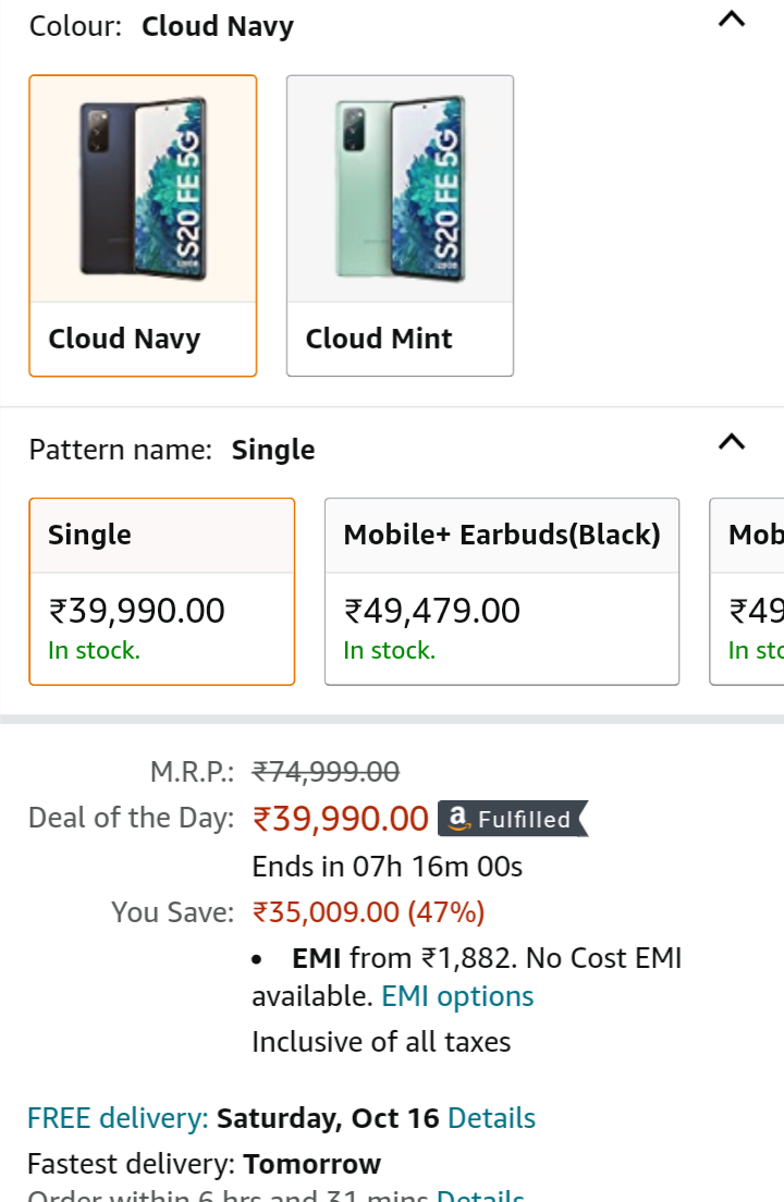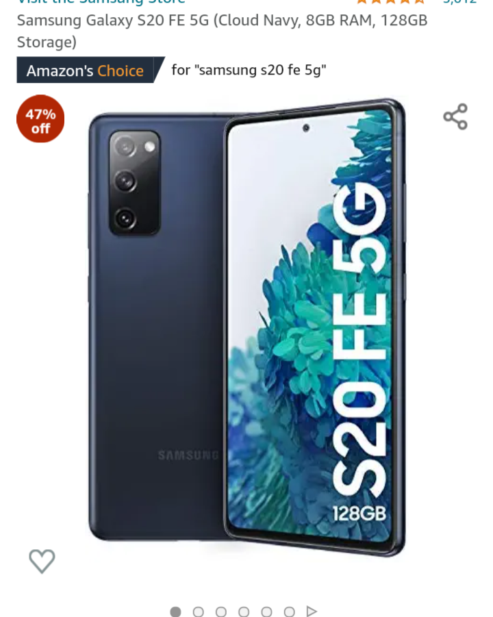 Deal of the day: Samsung Galaxy S20 FE 5G (Cloud Navy, 8GB RAM, 128GB Storage) https://www.amazon.in/dp/B08VB57558/ref=cm_sw_r_cp_apan_glt_fabc_dl_D3A4ZM55XECCZ5QBPC57?_encoding=UTF8&psc=1
