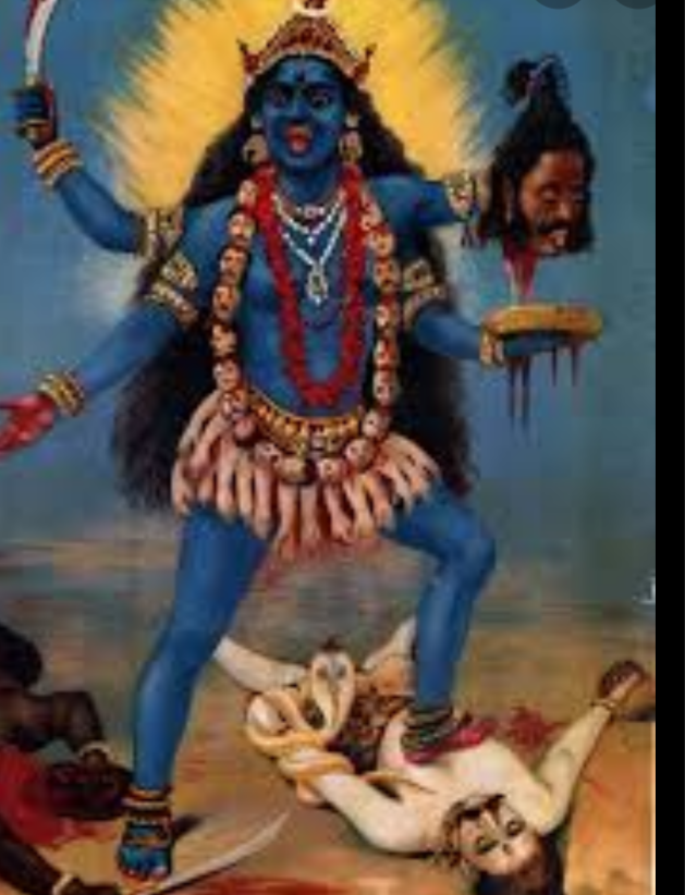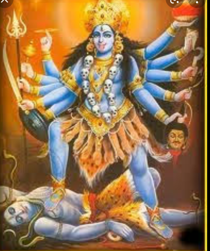 Kali’s earliest appearance is when she emerged from Lord Shiva. She is the ultimate manifestation of Shakti and the mother of all living beings.She destroys the evil in order to protect the innocent. Over time, Kali has been worshipped by devotional movements and tantric sects variously as the Divine Mother, Mother of the Universe, Adi Shakti, or Parvati.[1][2][3] Shakta Hindu and Tantric sects additionally worship her as the ultimate reality or Brahman.[3] She is also seen as the divine protector and the one who bestows moksha or liberation.[1] Kali is portrayed standing on Lord Shiva, with her right foot forward. Her skin color appears to be dark, and she is wearing a garland of 50 skulls, denoting 50 letters of sanskrit alphabet. She is four armed, holding a Kharag, in her top left arm, denoting strength. In her lower hand, she is holding a severed head denoting ego, which Kali hates. Both of her right hands are in abhay mudra, denoting that she is a kind mother, who protects and nurtures her children. She is completely naked, denoting that she is above this material world.